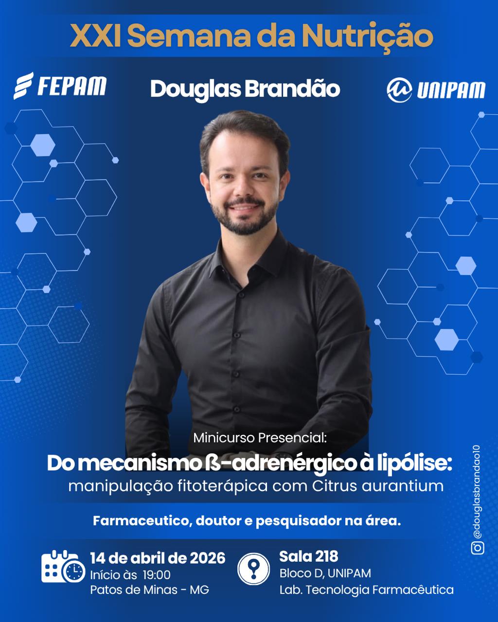 No segundo dia, 14 de abril (terça-feira), às 19h, na sala 119 do bloco F, será realizado o minicurso “Saúde da Mulher no Consultório: o que Todo Nutricionista Deveria Saber”, com Júlia Cristina. Paralelamente, no Laboratório de Tecnologia Farmacêutica, ocorrerá o minicurso “Do Mecanismo B-Adrenérgico à Lipólise: Manipulação Fitoterápica com Citrus aurantium”, com Douglas Brandão.
