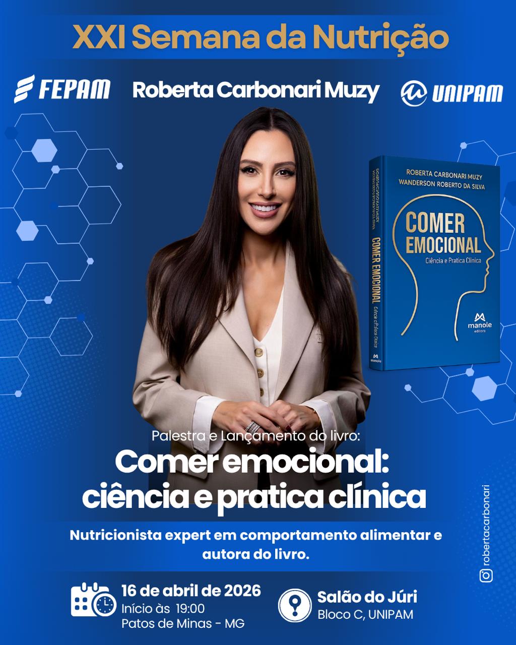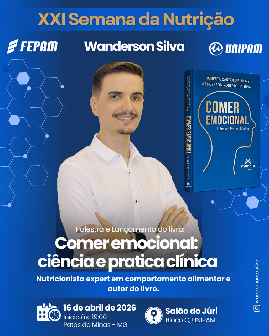 Para encerrar, no dia 16 de abril (quinta-feira), às 19h, no Salão do Júri, será realizado o lançamento do livro “Comer Emocional: Ciência e Prática Clínica” de autoria do professor Dr. Wanderson Silva e da nutricionista, Roberta Carbonari Muzy, profissional de destaque nacional. A obra reúne, de forma integrada, fundamentação científica atualizada e aplicações práticas, oferecendo suporte tanto para nutricionistas quanto para outros profissionais da saúde que atuam com comportamento alimentar.