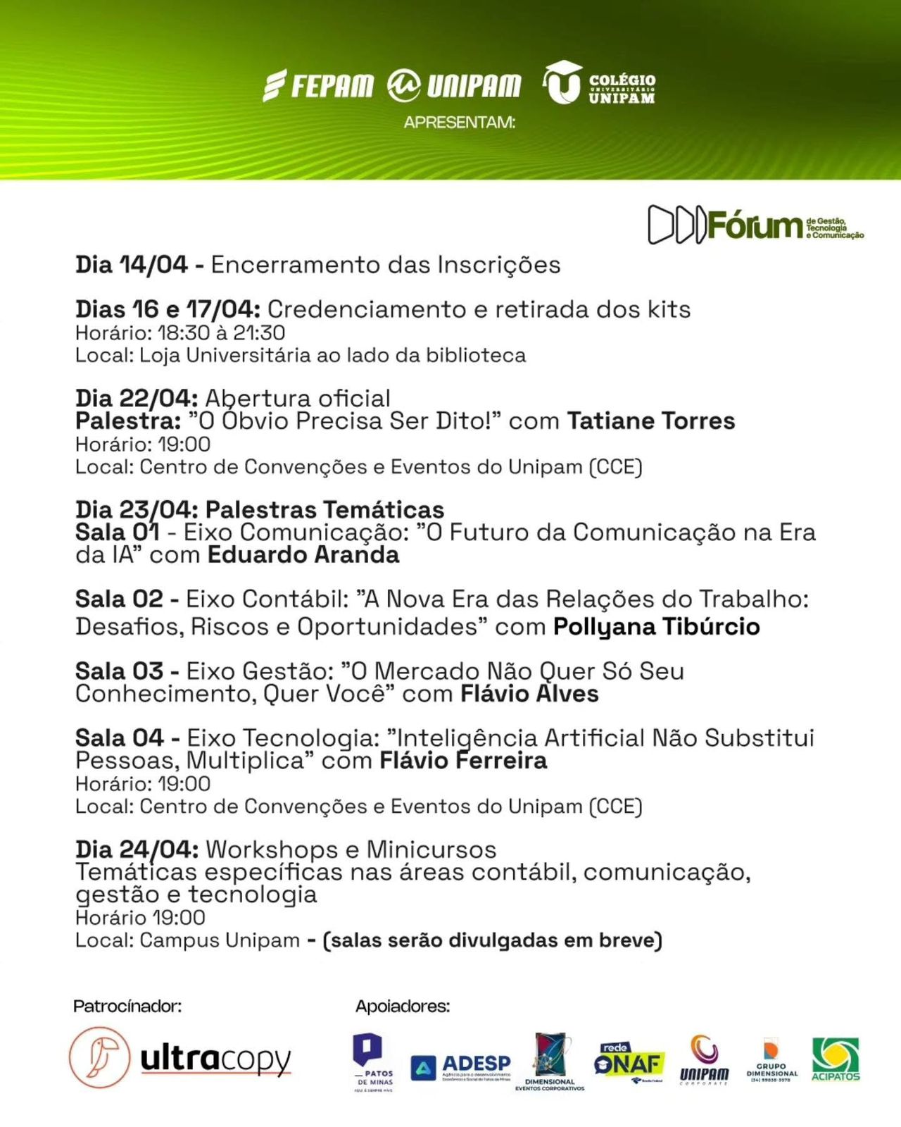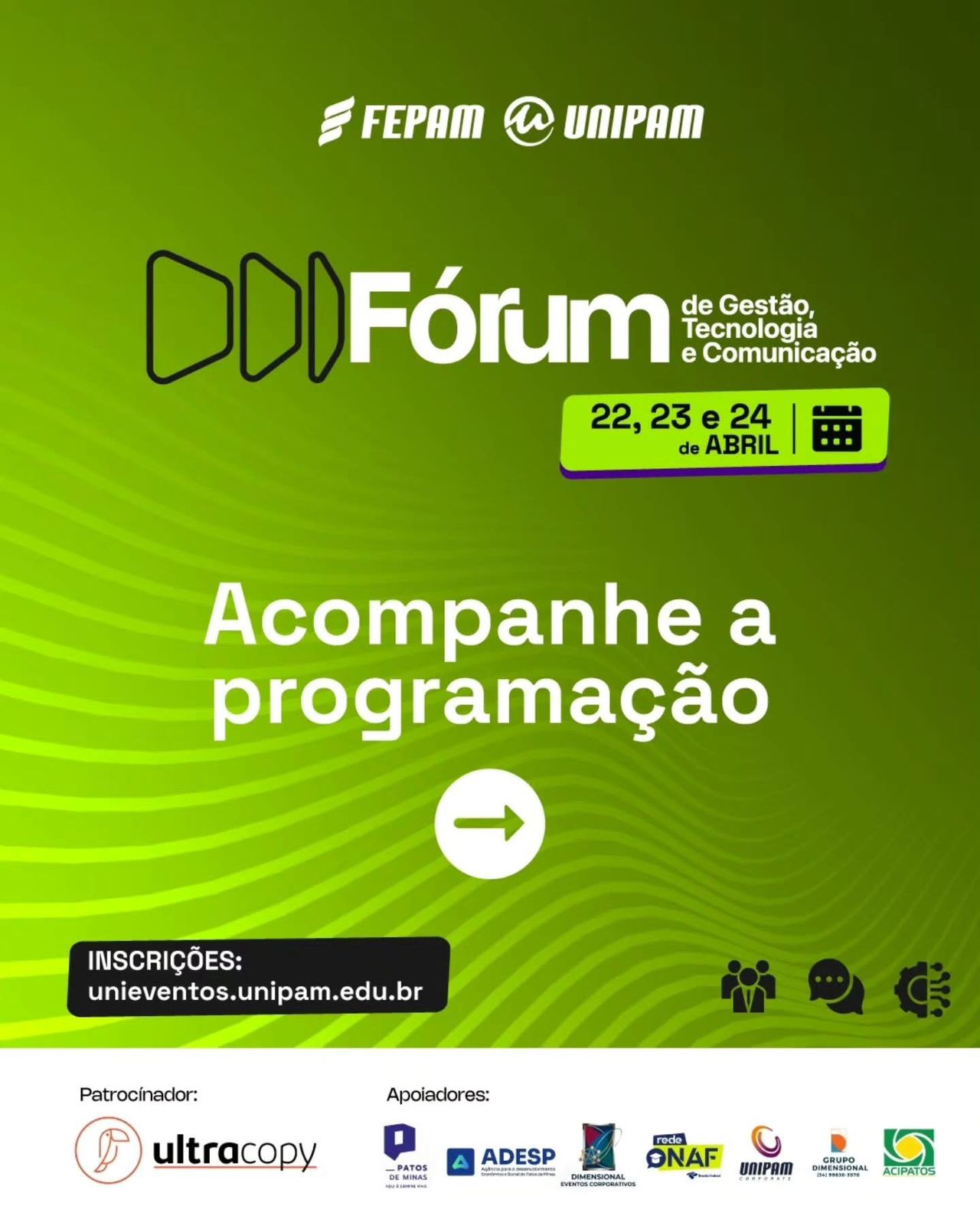 O Centro Universitário de Patos de Minas (UNIPAM) promoverá, de 22 a 24 de abril, no Centro de Convenções e Eventos (CCE) e no campus da instituição, o “Fórum de Gestão, Tecnologia e Comunicação”.