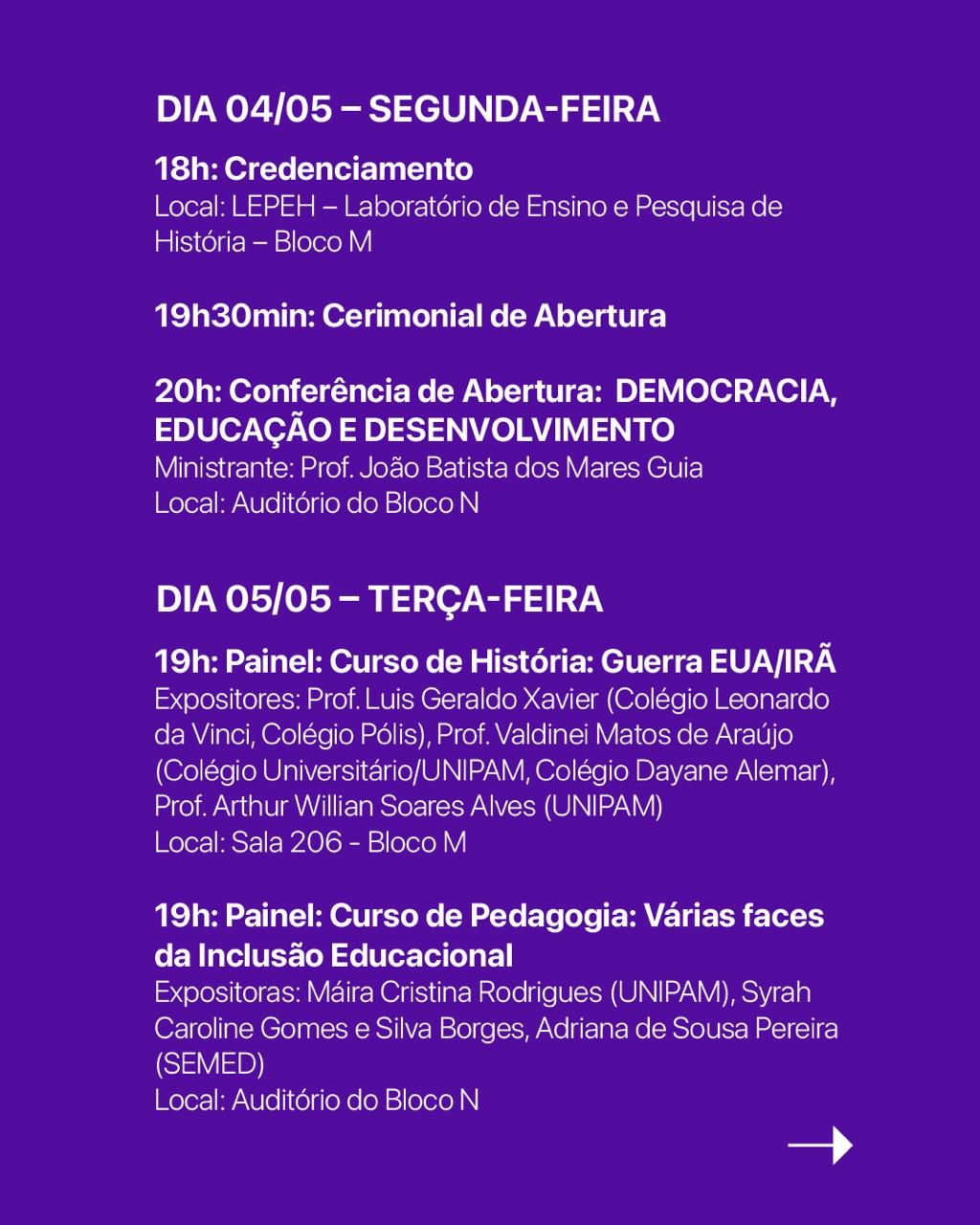 Ao longo da programação, no dia 05 de maio (terça-feira), às 19h, os alunos participarão de painéis temáticos que irão discutir questões atuais, como: os impactos de conflitos internacionais no ensino de História, exemplificados no debate sobre a guerra entre EUA e Irã, e os múltiplos aspectos da inclusão educacional, tema central das discussões do curso de Pedagogia.