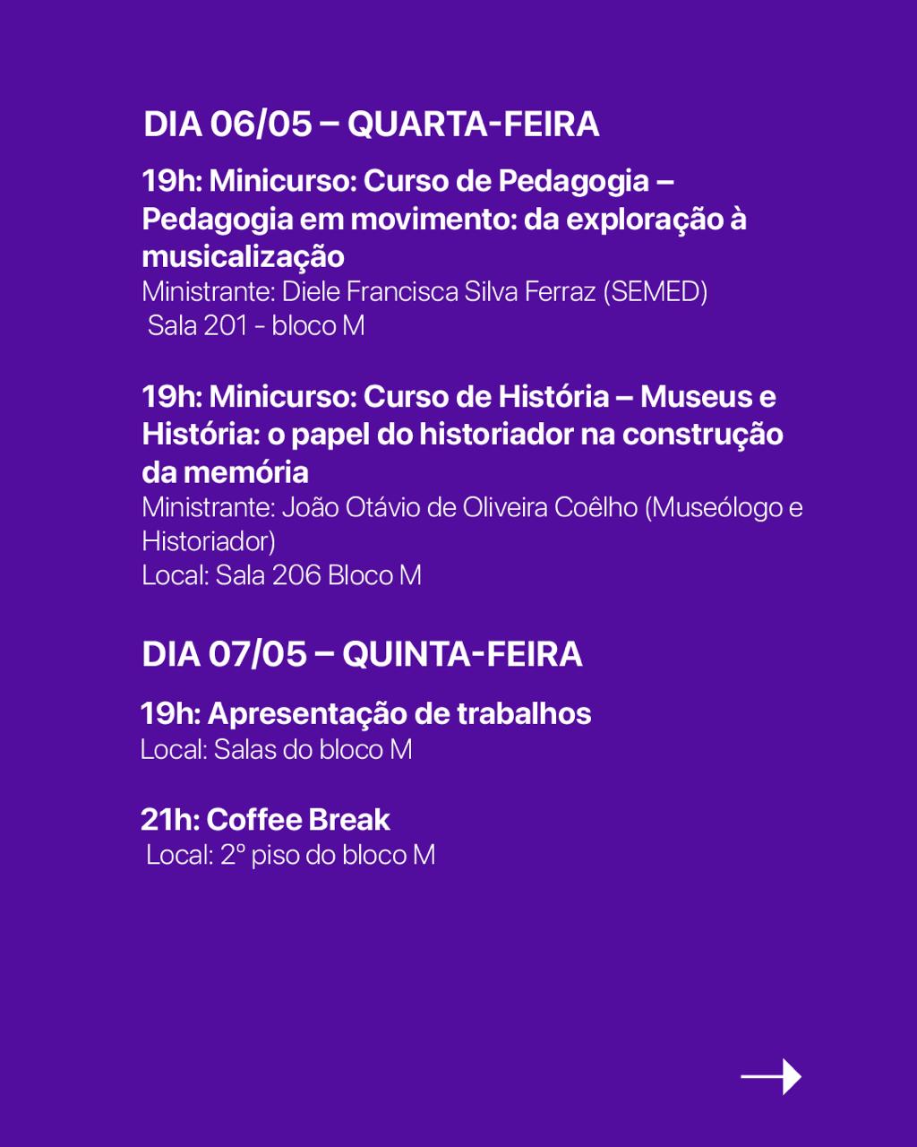 No dia 06 de maio (quarta-feira), a Jornada contará com minicursos que ampliam a formação prática dos alunos, com destaque para abordagens como pedagogia em movimento, envolvendo práticas de musicalização, e reflexões sobre o papel do historiador na preservação da memória, a partir da interface entre museus e história.