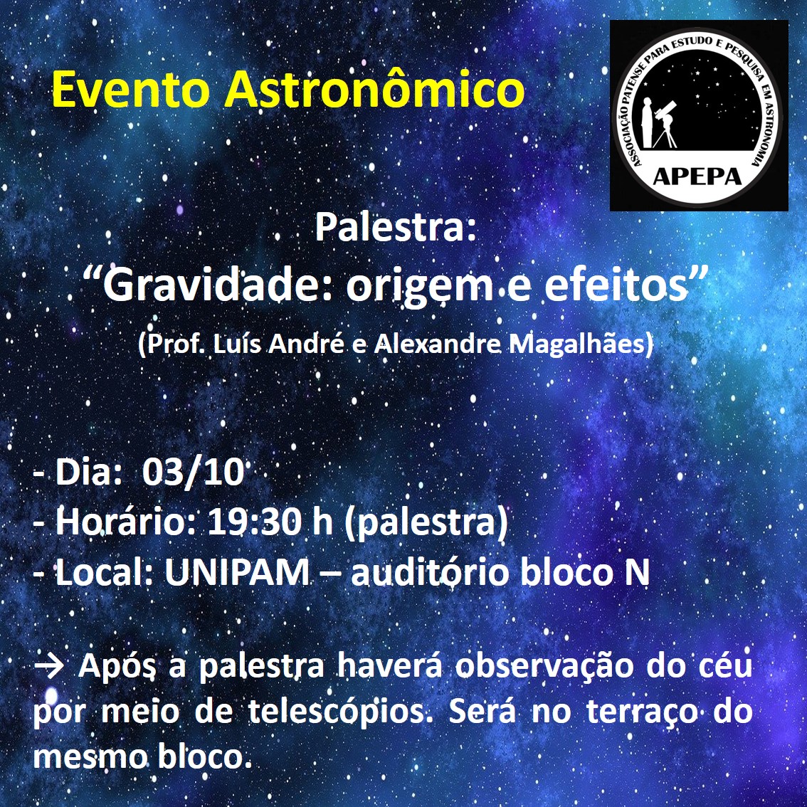 Será realizado no dia 03 de outubro (quinta-feira), às 19h30, no auditório do bloco N, do Centro Universitário de Patos de Minas (UNIPAM), a palestra “Gravidade: Origem e Efeitos”. Logo após, ocorrerá a observação do céu por meio telescópios, no terraço do Bloco N.