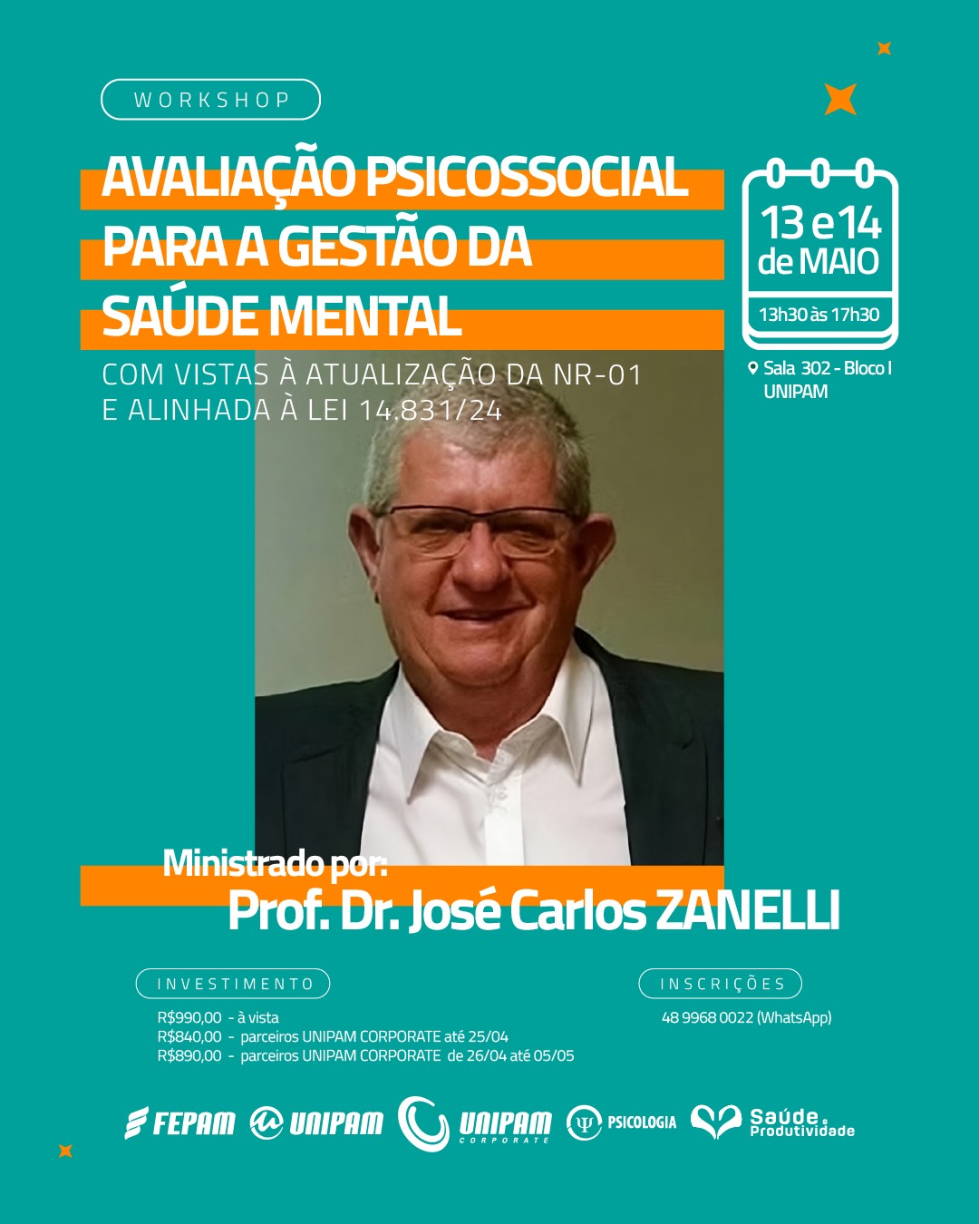 O curso de Psicologia do Centro Universitário de Patos de Minas (UNIPAM), em parceria com o Instituto Zanelli - Saúde e Produtividade e com o Programa UNIPAM Corporate, promoverá nos dias 13 e 14 de maio, das 13h30 às 17h30, na Sala 302 do Bloco I, o workshop “Avaliação Psicossocial para a Gestão da Saúde Mental - Atualização da NR-01 alinhada à lei 14.831/24”.