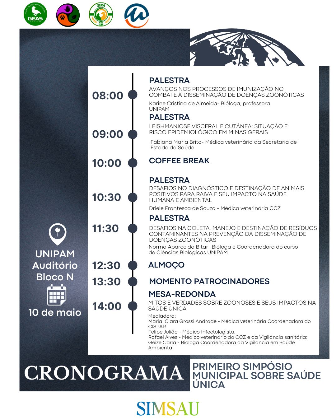 O evento contará com palestras e com uma mesa-redonda, que serão abertos aos profissionais da área da saúde (humana e animal), colaboradores do Centro de Controle de Zoonoses (CCZ), do Instituto Estadual de Florestas (IEF) e acadêmicos dos cursos de Ciências Biológicas, de Enfermagem, de Farmácia, de Medicina, de Medicina Veterinária, Técnico em Enfermagem e Técnico em Farmácia.