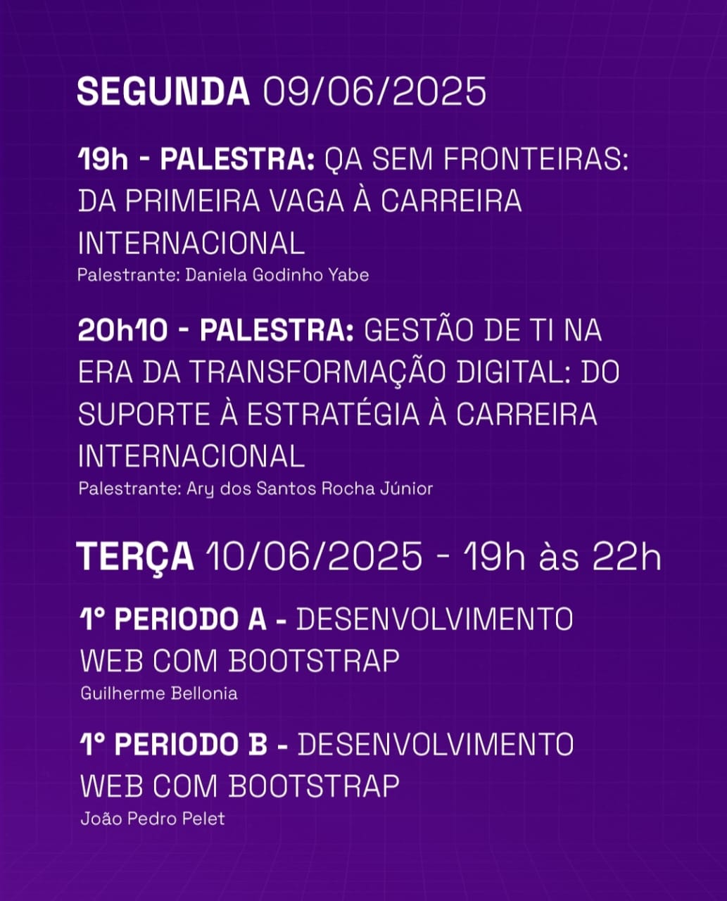 No primeiro dia, 09 de junho (segunda-feira), às 19h, será ministrada a palestra “QA sem Fronteiras: da Primeira Vaga à Carreira Internacional” com Daniela Godinho Yabe. Às 20h10, ocorrerá a palestra “Gestão de TI na Era da Transformação Digital: do Suporte à Estratégia” com Ary dos Santos Rocha Júnior.