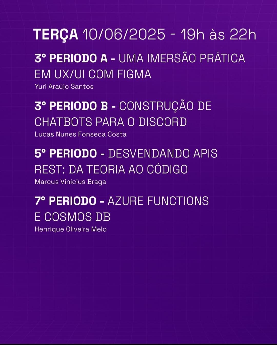No segundo dia, 10 de junho (terça-feira), às 19h, ocorrerão os minicursos organizados por períodos. São eles: “Desenvolvimento Web com Bootstrap”, “Uma Imersão Prática em UX/UI com Figma”, “Construção de Chatbots para o Discord”, “Desvendando APIS REST: da Teoria ao Código” e “Azure Functions e Cosmos DB”.