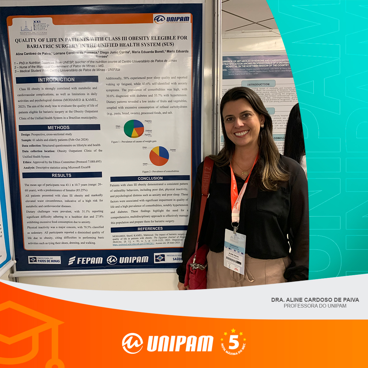 O segundo “Qualidade de Vida de Pacientes com Obesidade Grau III antes da Realização da Cirurgia Bariátrica no Sistema Único de Saúde (SUS)” apresentou dados dos pacientes acompanhados no Ambulatório de Obesidade da Prefeitura de Patos de Minas por alunos dos cursos de Medicina, de Nutrição e de Psicologia do UNIPAM. Os resultados mostraram que os pacientes apresentam alimentação inadequada, falta de atividade física, estresse e ansiedade. Esses fatores impactam negativamente na qualidade de vida e predispõe ao risco de doenças metabólicas, como: diabetes e hipertensão arterial. Além disso, os resultados reforçam a importância do acompanhamento multiprofissional para os pacientes antes da realização da cirurgia bariátrica.