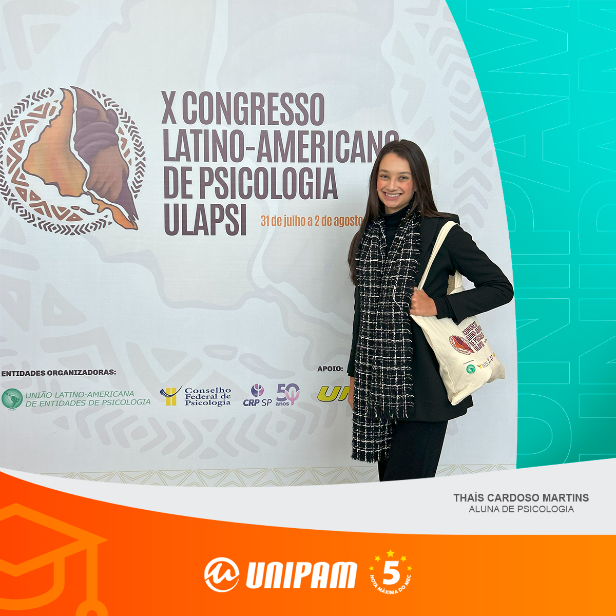 A aluna Thaís Cardoso Martins, do 6º período do curso de Psicologia do Centro Universitário de Patos de Minas (UNIPAM), participou do X Congresso Latino Americano de Psicologia (ULAPSI), realizado entre os dias 31 de julho e 02 de agosto, em São Paulo (SP).