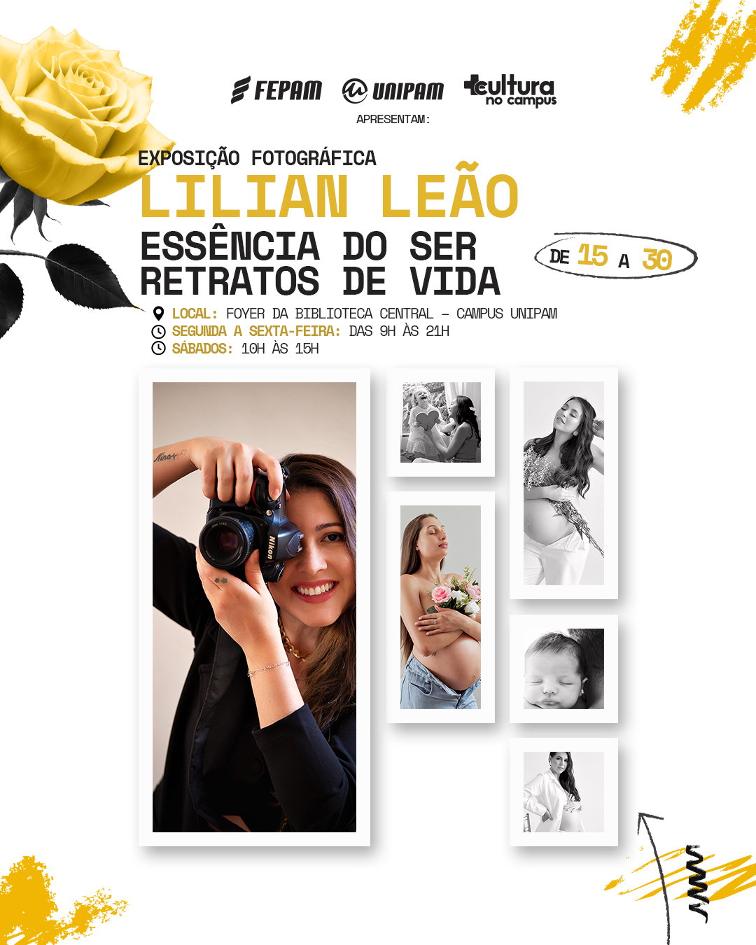 Entre os dias 15 e 30 de setembro, o Centro Universitário de Patos de Minas (UNIPAM), recebe a exposição fotográfica “Essência do Ser - Retratos de Vida”, da fotógrafa Lilian Leão. A mostra acontece no foyer da Biblioteca, no campus UNIPAM, e integra as ações do Programa Mais Cultura no Campus.