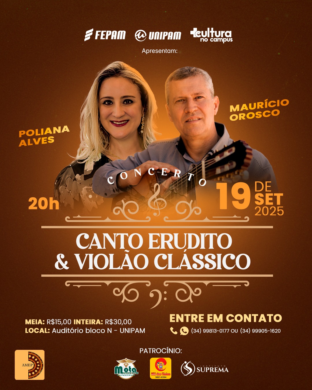 A Fundação Educacional de Patos de Minas (FEPAM) e o Centro Universitário de Patos de Minas (UNIPAM), por meio do Programa Mais Cultura no Campus, em parceria com a Associação de Música Erudita de Patos de Minas, promovem no dia 19 de setembro (quinta-feira), às 20h, o espetáculo “Canto Erudito & Violão Clássico”. O evento será realizado no auditório do Bloco N, no campus do UNIPAM.