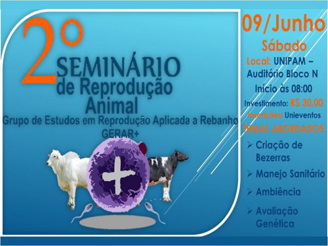 O Grupo de Estudos em Reprodução Aplicada a Rebanho (GERAR +) do Centro Universitário de Patos de Minas (UNIPAM) promoverá no dia 9 de junho, a partir das 8h, no Auditório do Bloco N, o 2º Seminário de Reprodução Animal.