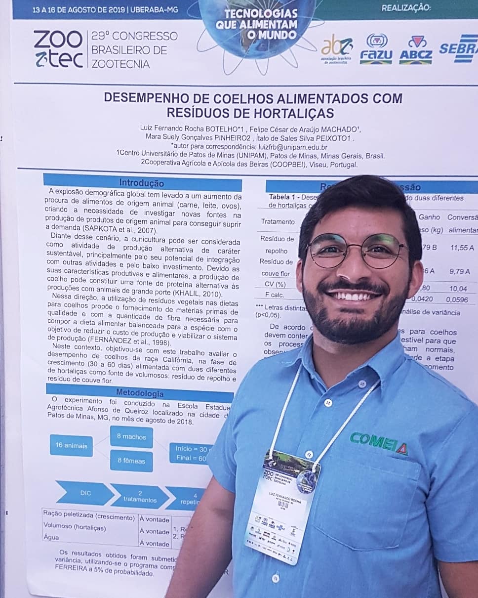 O coordenador do curso de Zootecnia do Centro Universitário de Patos de Minas (UNIPAM), professor Luiz Fernando Rocha Botelho, juntamente com os alunos Hérick Pacheco Rodrigues, Isabella Cristina Corrêa da Mata e João Pedro Maciel Oliveira, participaram de 13 a 16 de agosto, do Congresso Brasileiro de Zootecnia (ZOOTEC), realizado em Uberaba (MG).