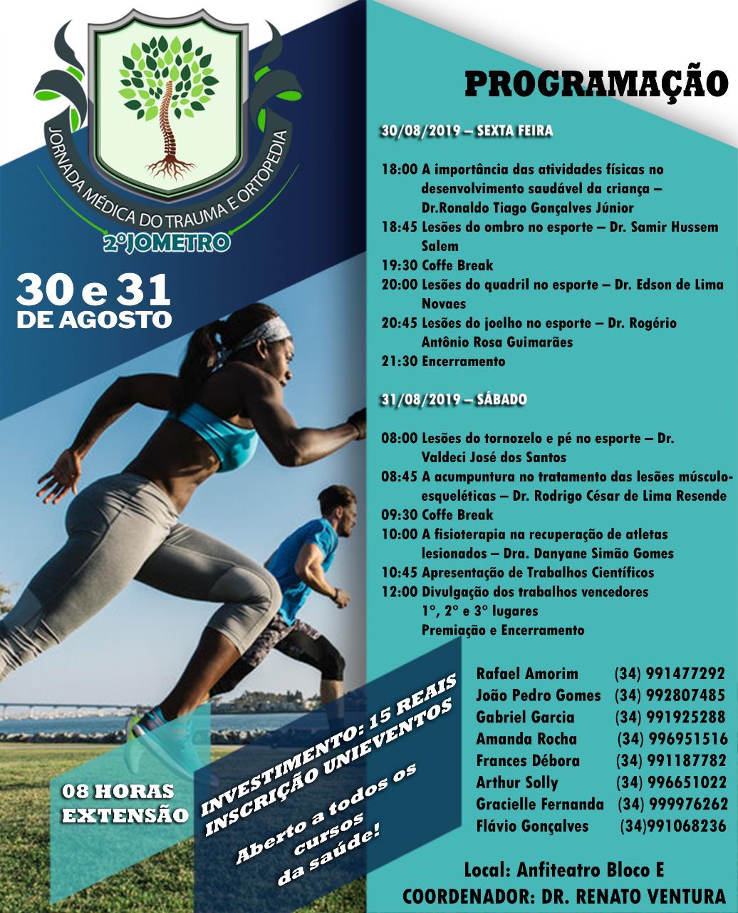 Alunos do curso de Medicina do Centro Universitário de Patos de Minas (UNIPAM), juntamente com integrantes da Liga Acadêmica de Ortopedia e Traumatologia (LAOT), sob orientação do professor Renato Ventura, promoverão nos dias 30 e 31 de agosto, no auditório do bloco E, a II Jornada Médica do Trauma e Ortopedia (JOMETRO).