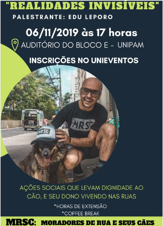 O palestrante é idealizador do projeto “MRSC: Moradores de Rua e Seus Cães”. Na oportunidade, ele falará sobre as ações sociais que levam dignidade ao dono e ao cão, que vivem nas ruas.